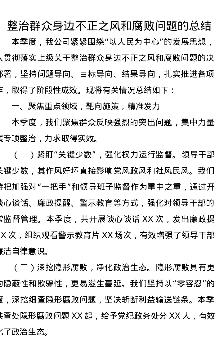 整治群众身边不正之风和腐败问题的总结