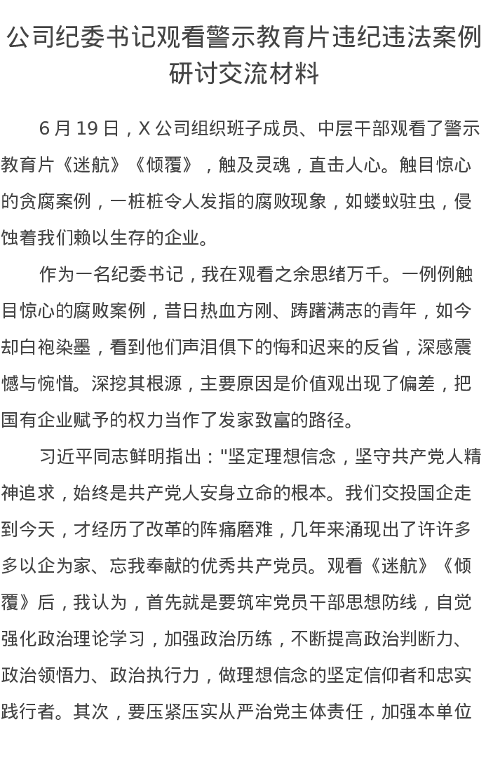 公司纪委书记观看警示教育片违纪违法案例研讨交流发言材料