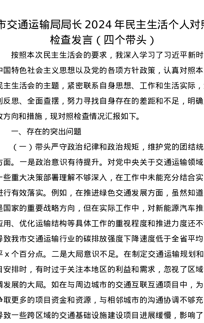 市交通运输局局长2024年民主生活个人对照检查发言(四个带头)