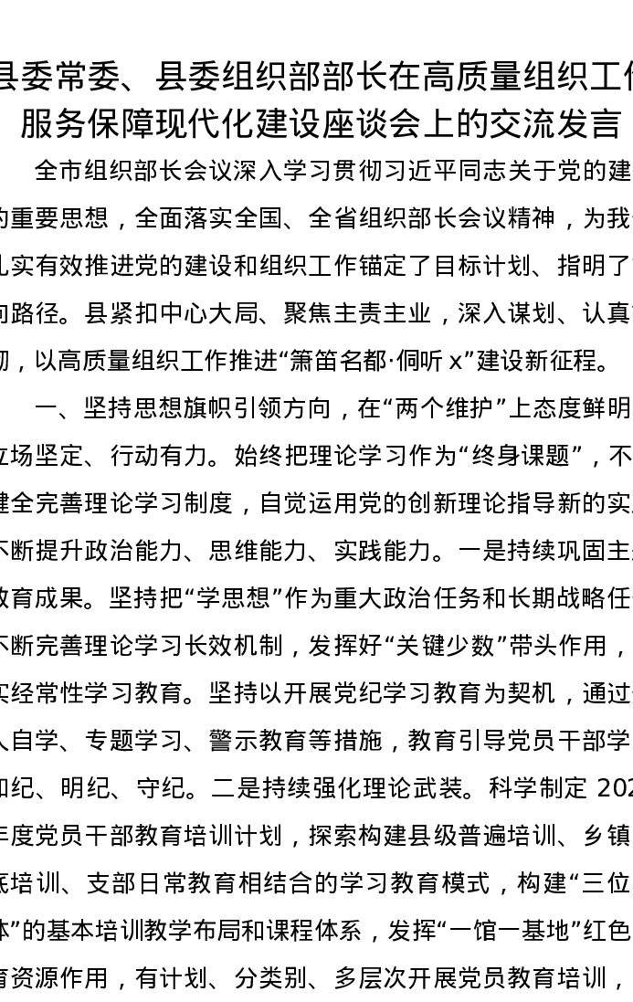 县委常委、县委组织部部长在高质量组织工作服务保障现代化建设座谈会上的交流发言