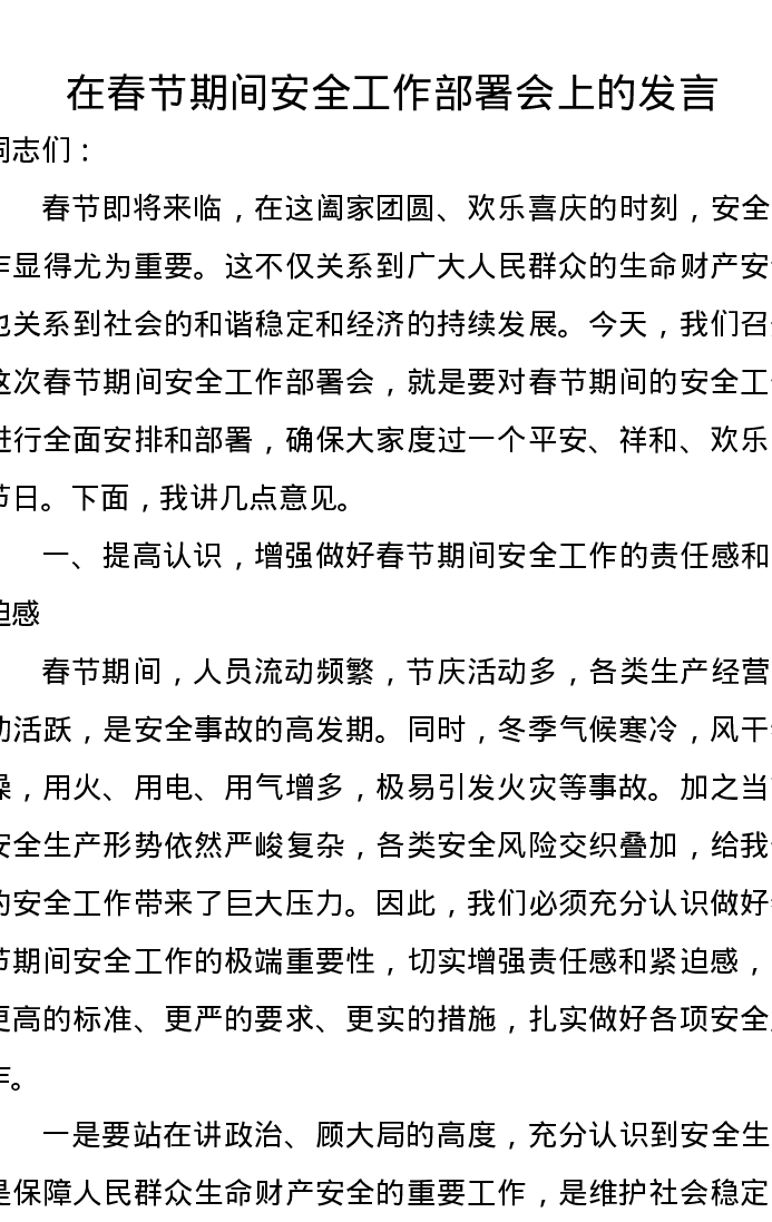 在春节期间安全工作部署会上的发言