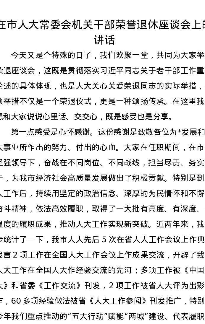 在市人大常委会机关干部荣誉退休座谈会上的讲话