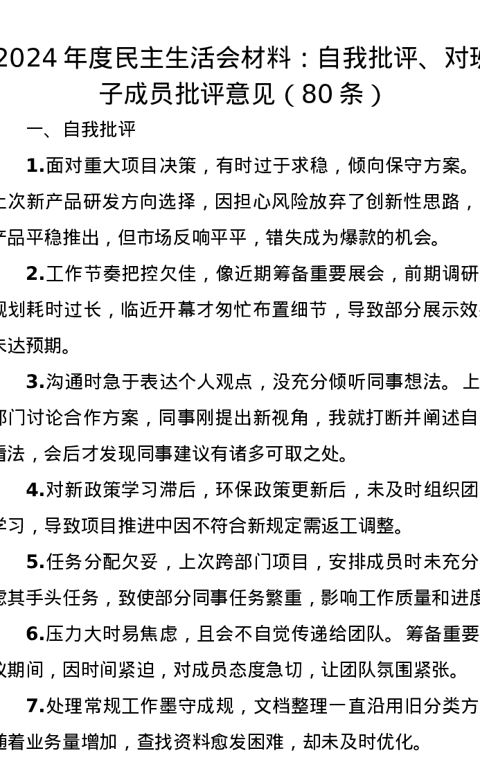 2024年度民主生活会材料:自我批评、对班子成员批评意见(80条)