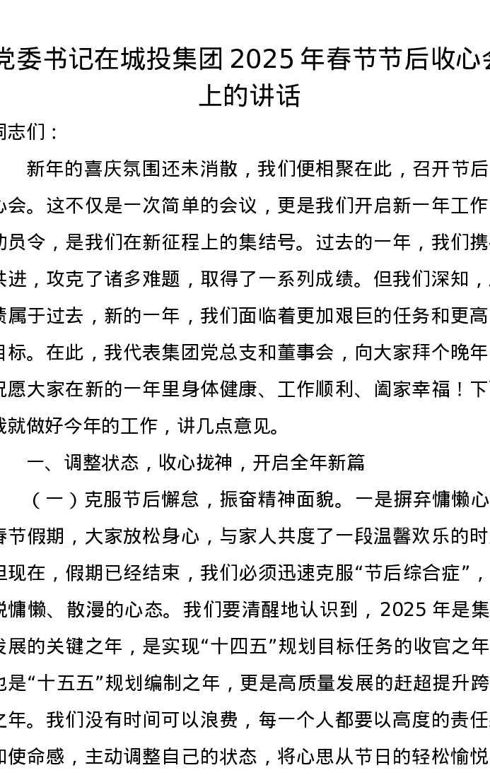 党委书记在城投集团2025年春节节后收心会上的讲话