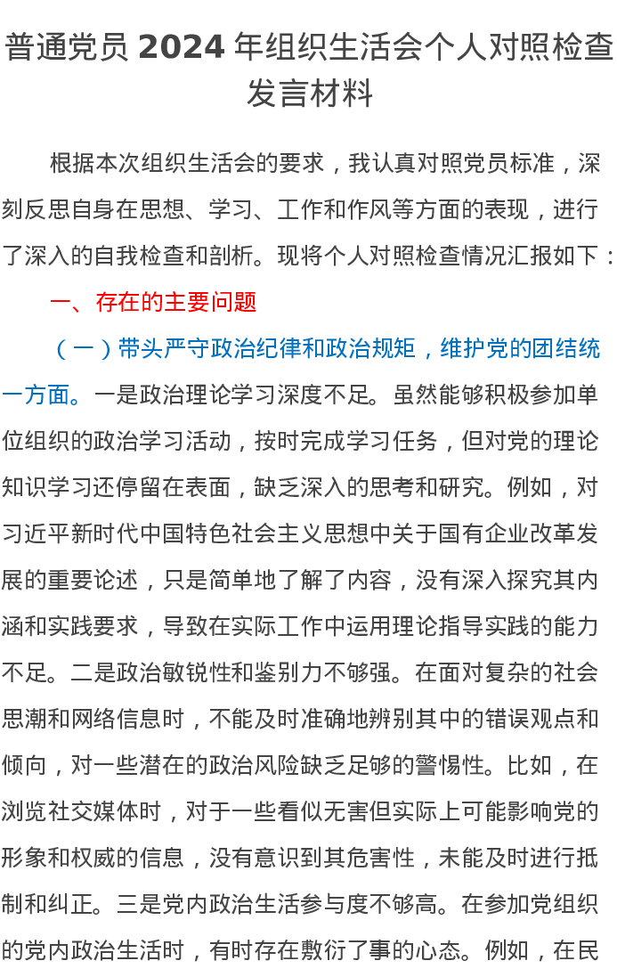 普通党员2024年组织生活会个人对照检查发言材料(四个带头)