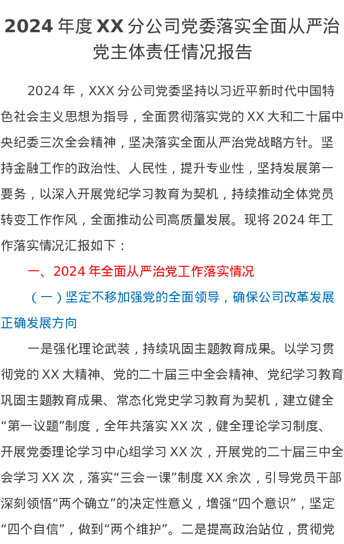 2024年度XX分公司党委落实全面从严治党主体责任情况报告