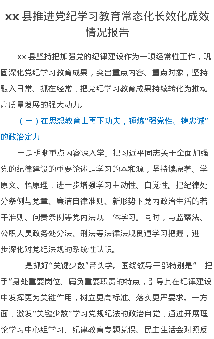 xx县推进党纪学习教育常态化长效化成效情况报告