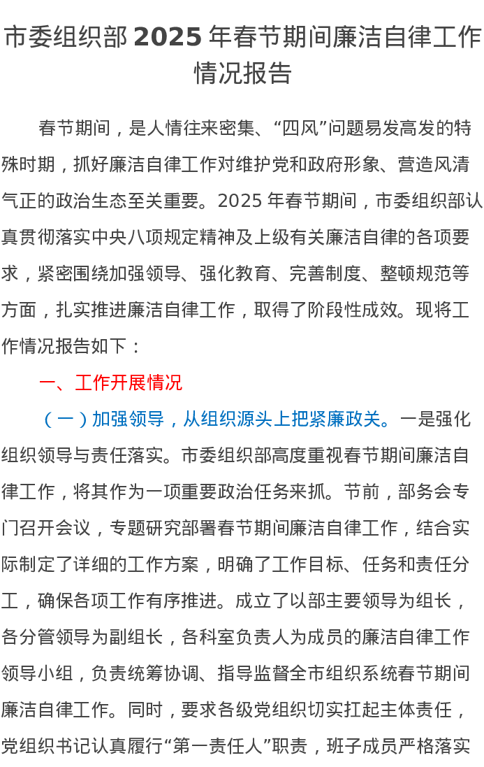 市委组织部2025年春节期间廉洁自律工作情况报告