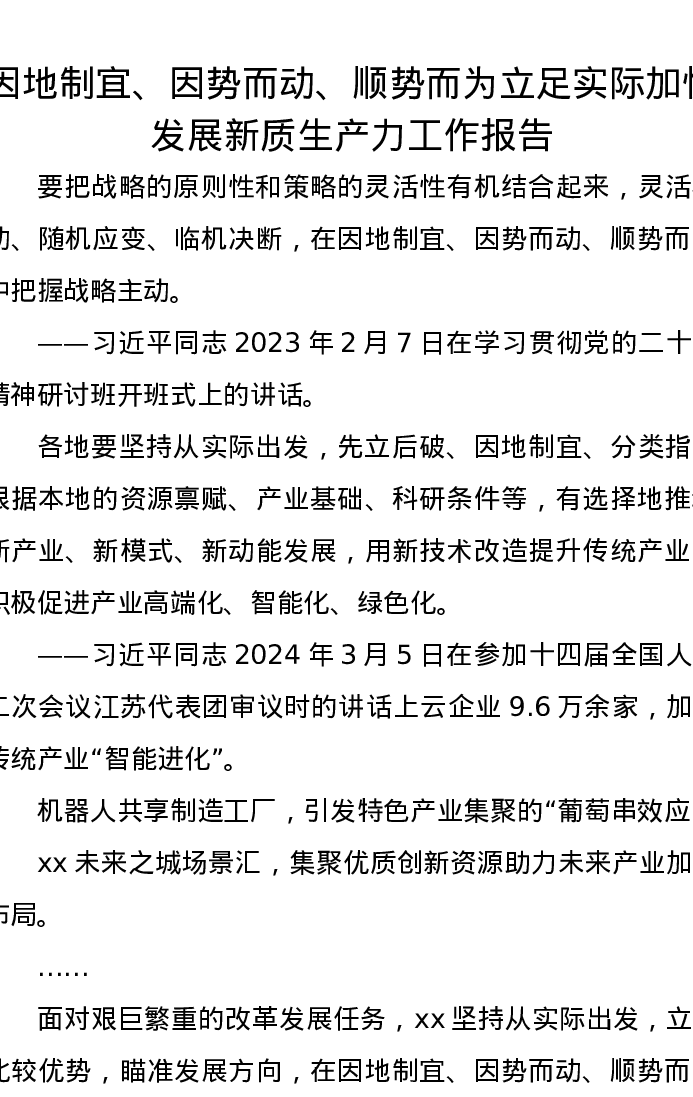 因地制宜、因势而动、顺势而为立足实际加快发展新质生产力工作报告