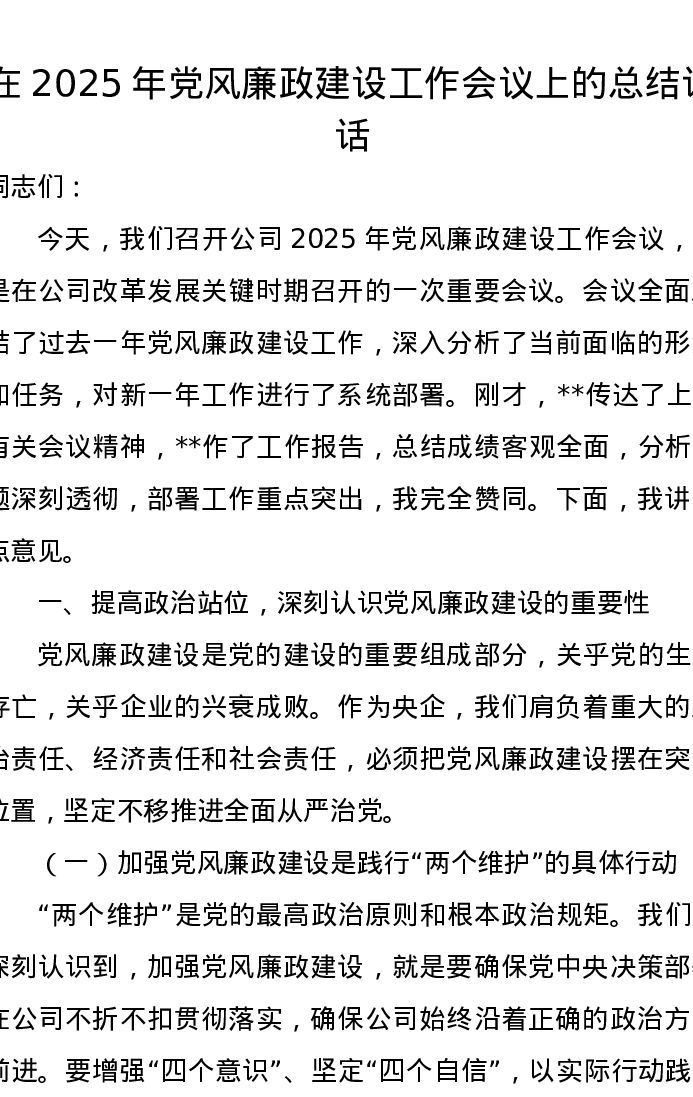 在2025年党风廉政建设工作会议上的总结讲话