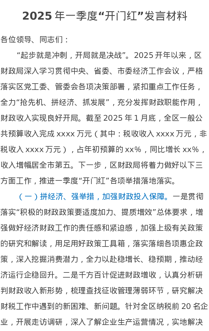 2025年一季度“开门红”发言材料