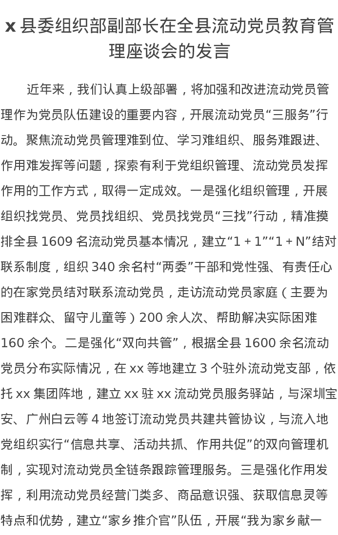 x县委组织部副部长在全县流动党员教育管理座谈会的发言
