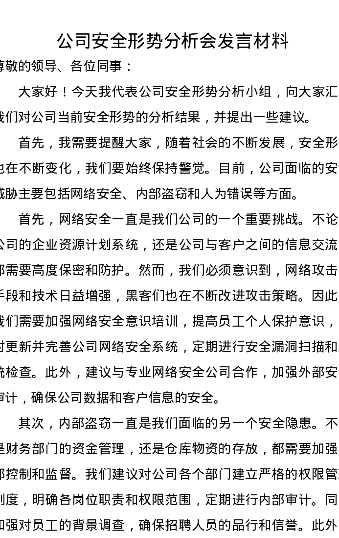 公司安全形势分析会发言材料