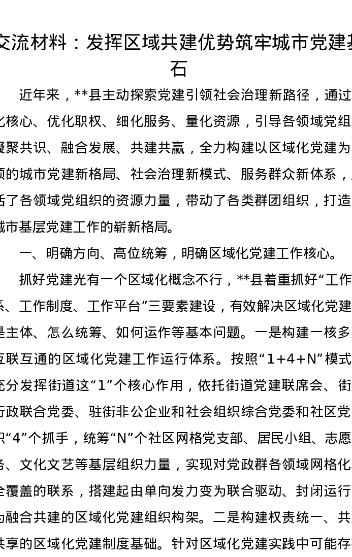 交流发言材料:发挥区域共建优势 筑牢城市党建基石