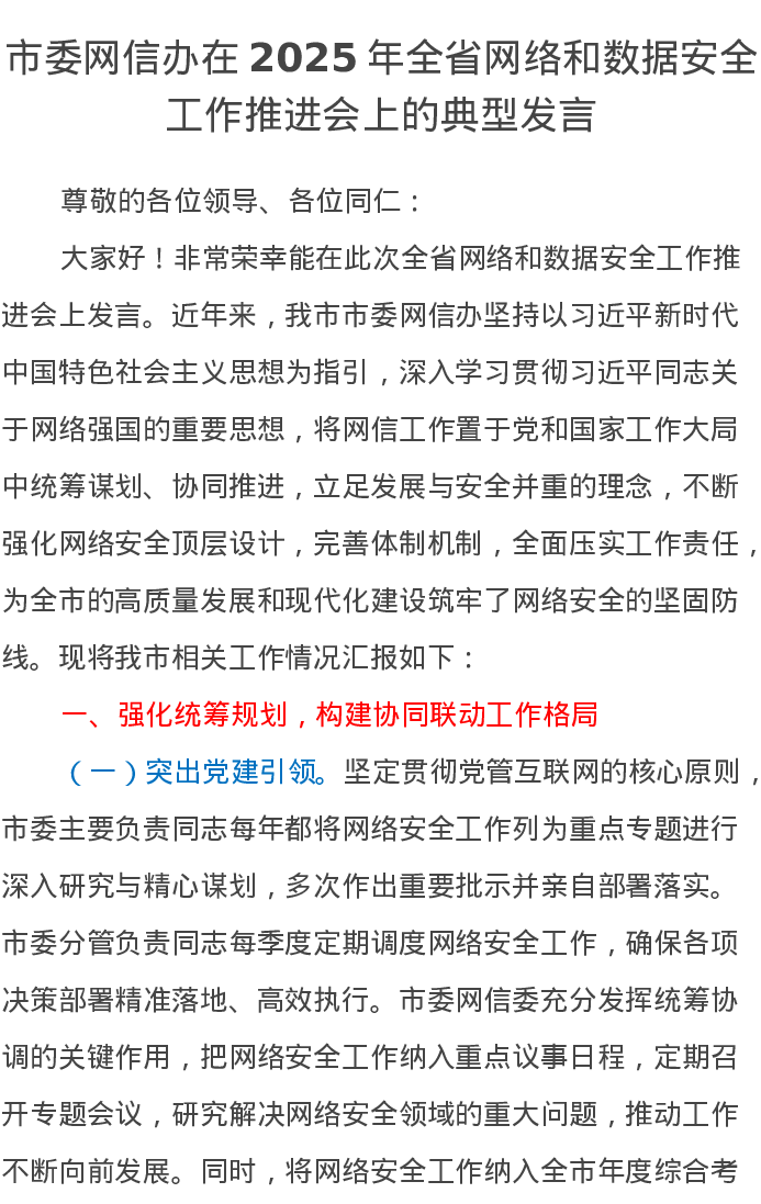 市委网信办在2025年全省网络和数据安全工作推进会上的典型发言
