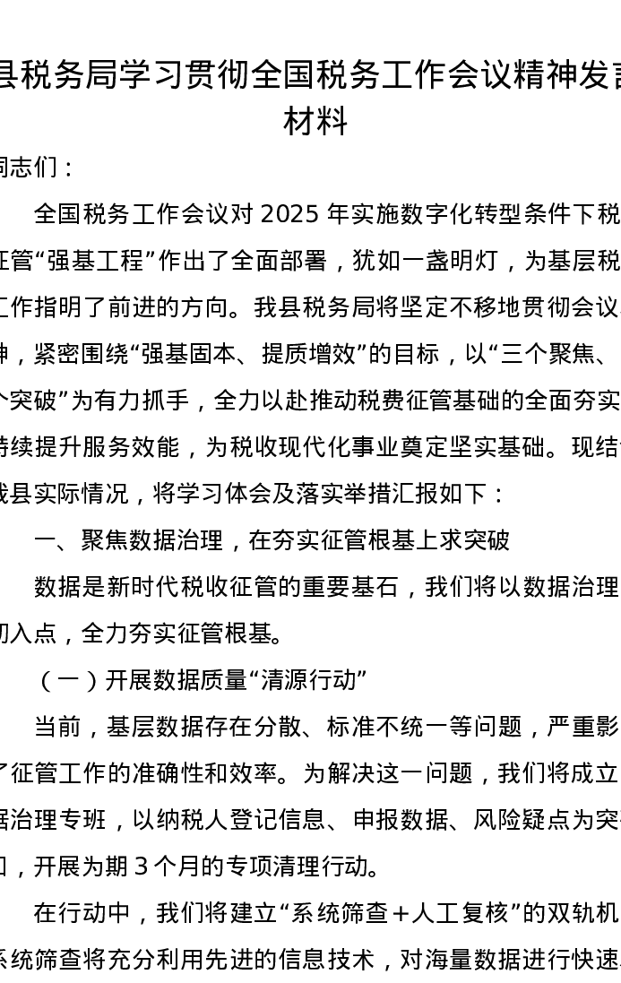 县税务局学习贯彻全国税务工作会议精神发言材料