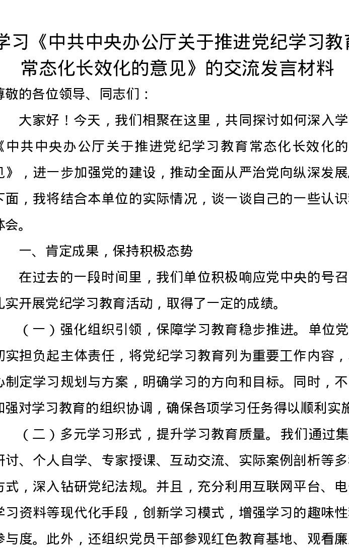 学习《中共中央办公厅关于推进党纪学习教育常态化长效化的意见》的交流发言材料