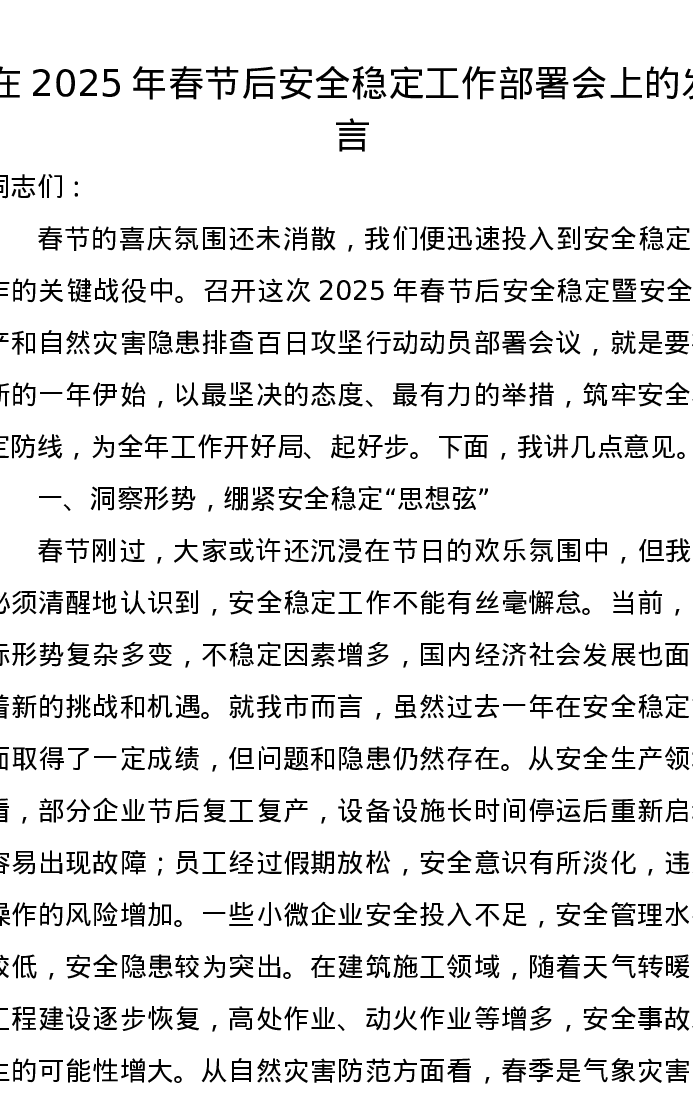 在2025年春节后安全稳定工作部署会上的发言