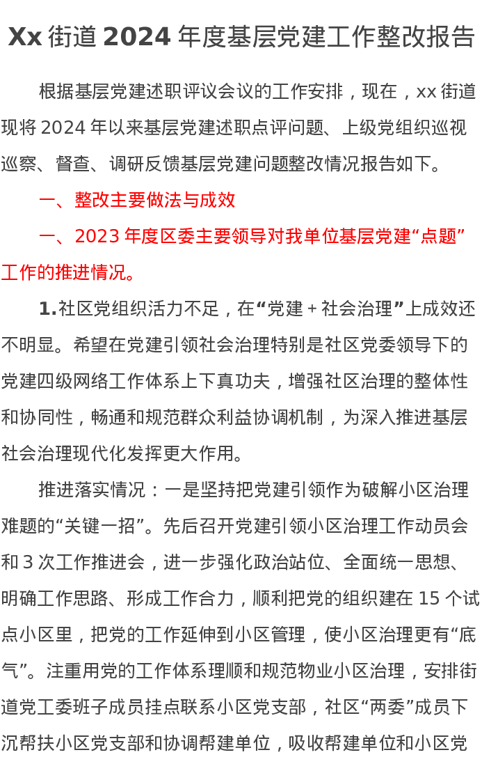 Xx街道2024年度基层党建工作整改报告