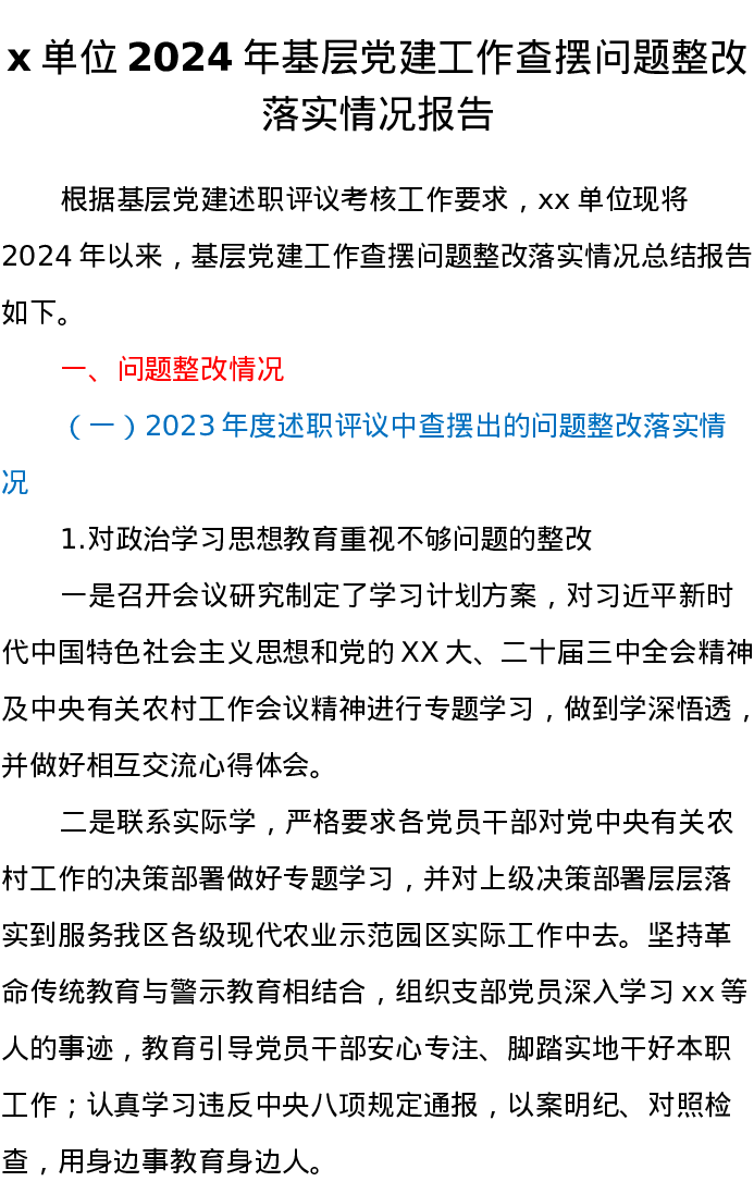 x单位2024年基层党建工作查摆问题整改落实情况报告