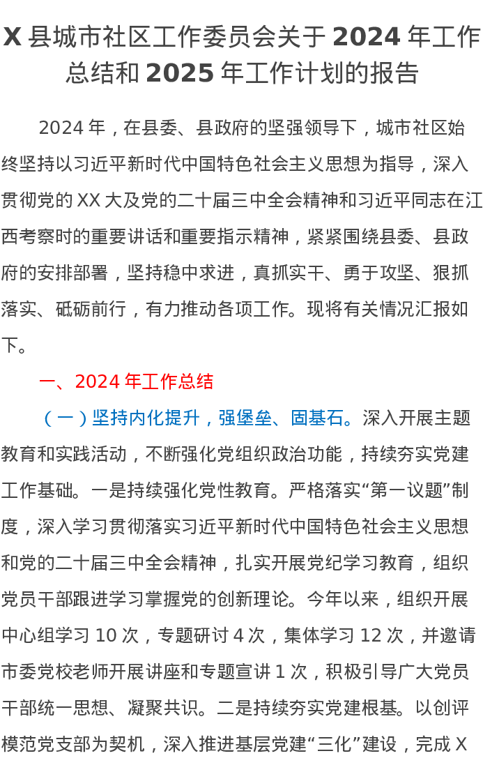 X县城市社区工作委员会关于2024年工作总结和2025年工作计划的报告