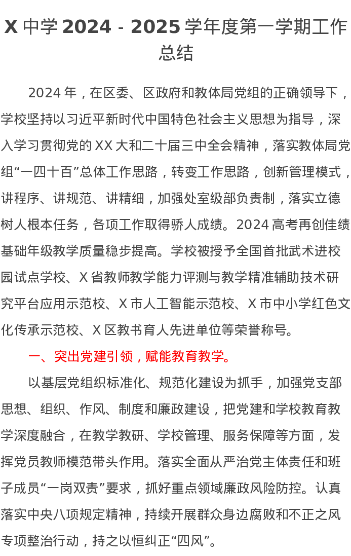 X中学2024-2025学年度第一学期工作总结