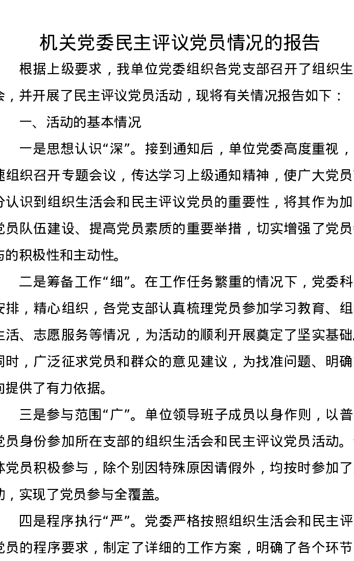 机关党委民主评议党员情况的报告