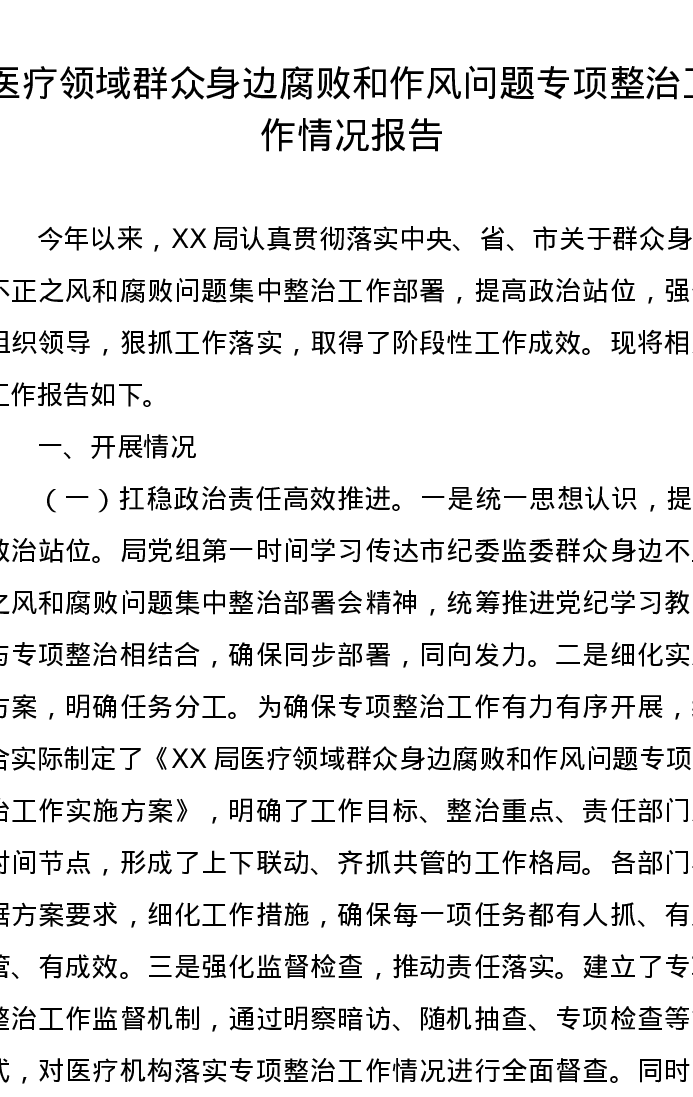 医疗领域群众身边腐败和作风问题专项整治工作情况报告