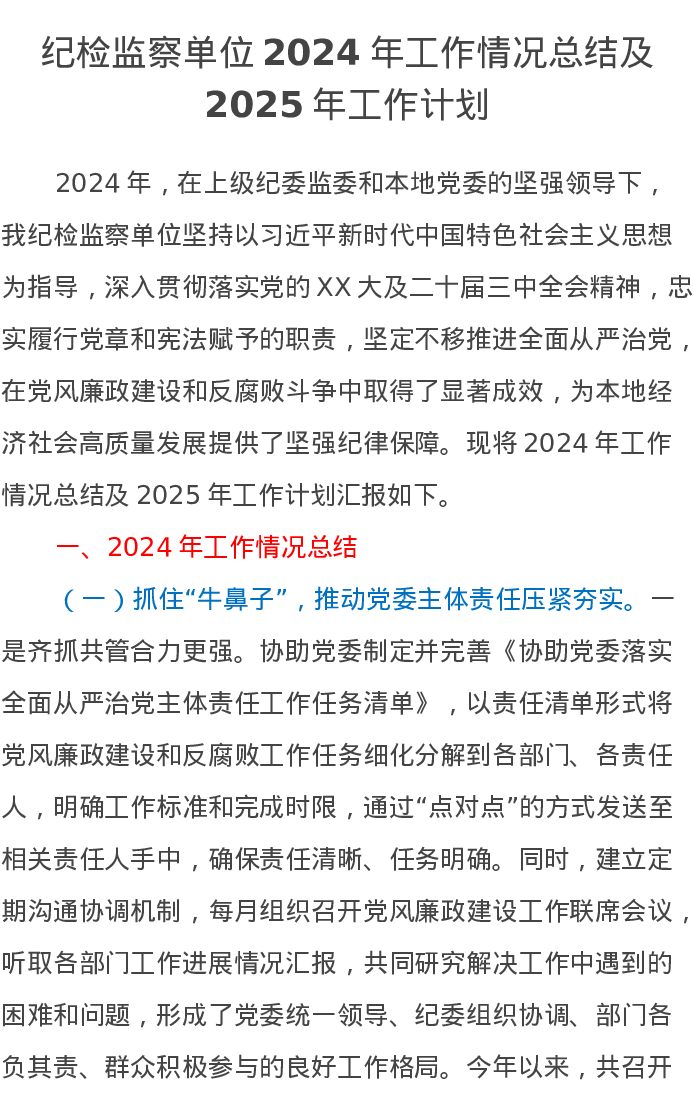 纪检监察单位2024年工作情况总结及2025年工作计划