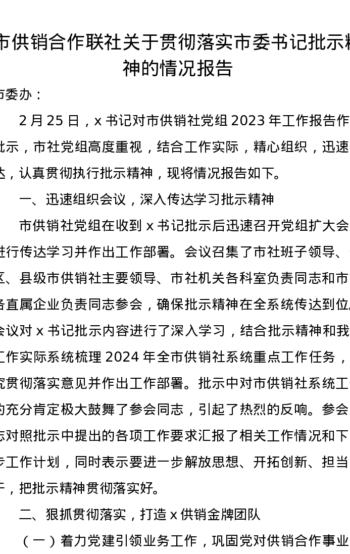 市供销合作联社关于贯彻落实市委书记批示精神的情况报告