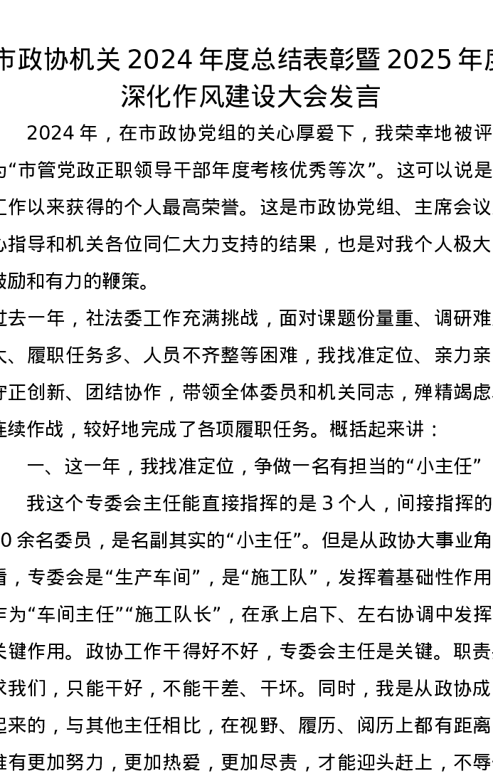 市政协机关2024年度总结表彰暨2025年度深化作风建设大会发言