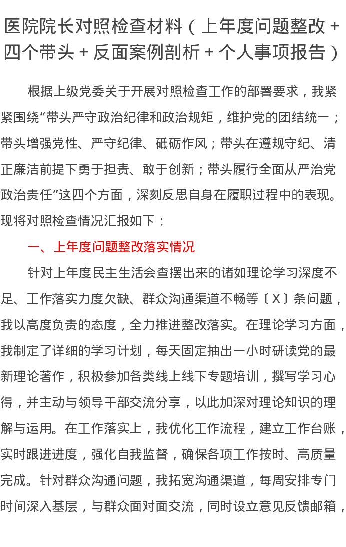 医院院长对照检查材料(上年度问题整改+四个带头+反面案例剖析+个人事项报告)