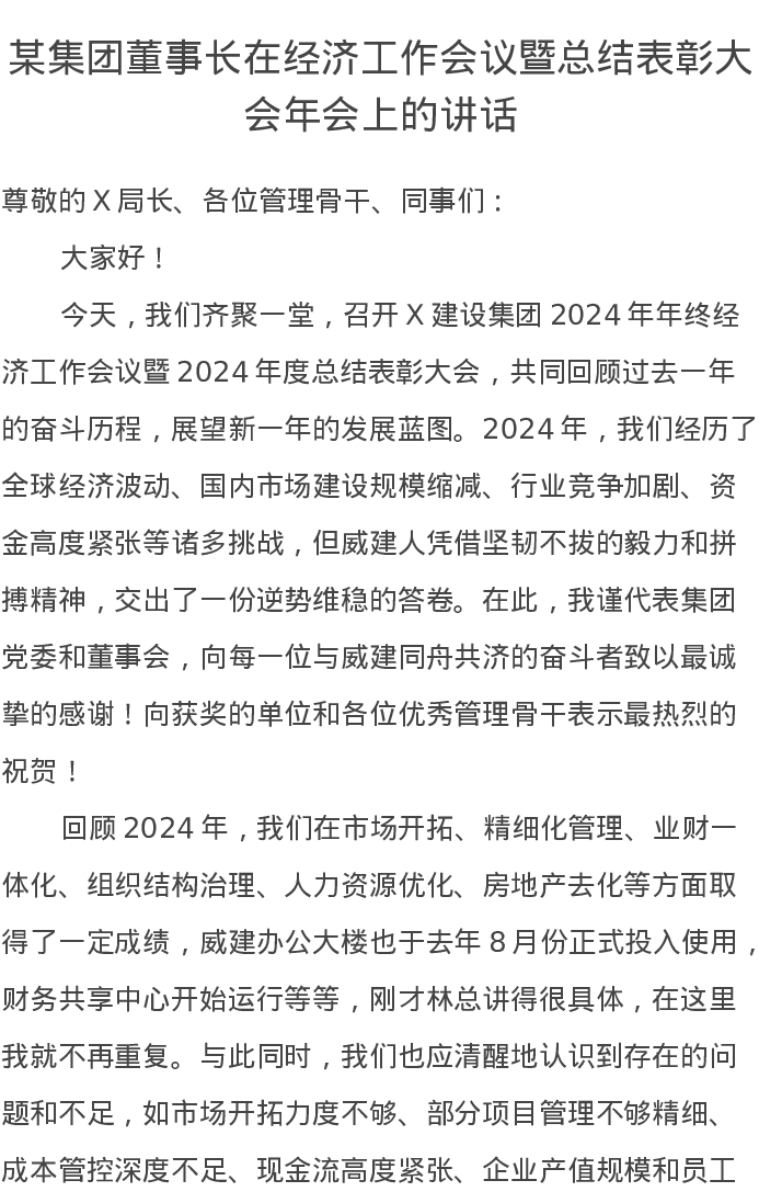 某集团董事长在经济工作会议暨总结表彰大会年会上的讲话:乙巳年定方向再出发