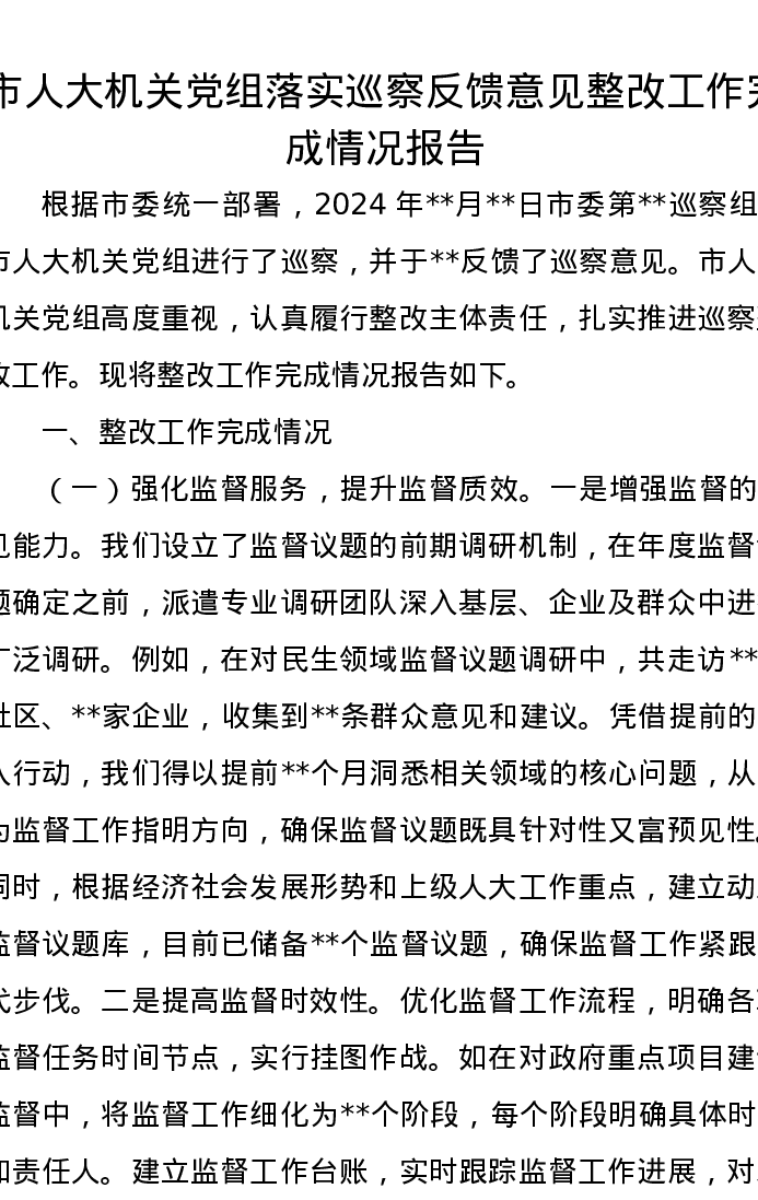 市人大机关党组落实巡察反馈意见整改工作完成情况报告