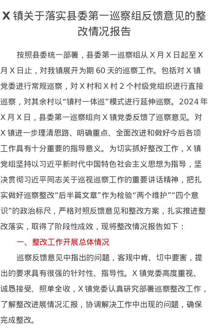 X镇关于落实县委第一巡察组反馈意见的整改情况报告