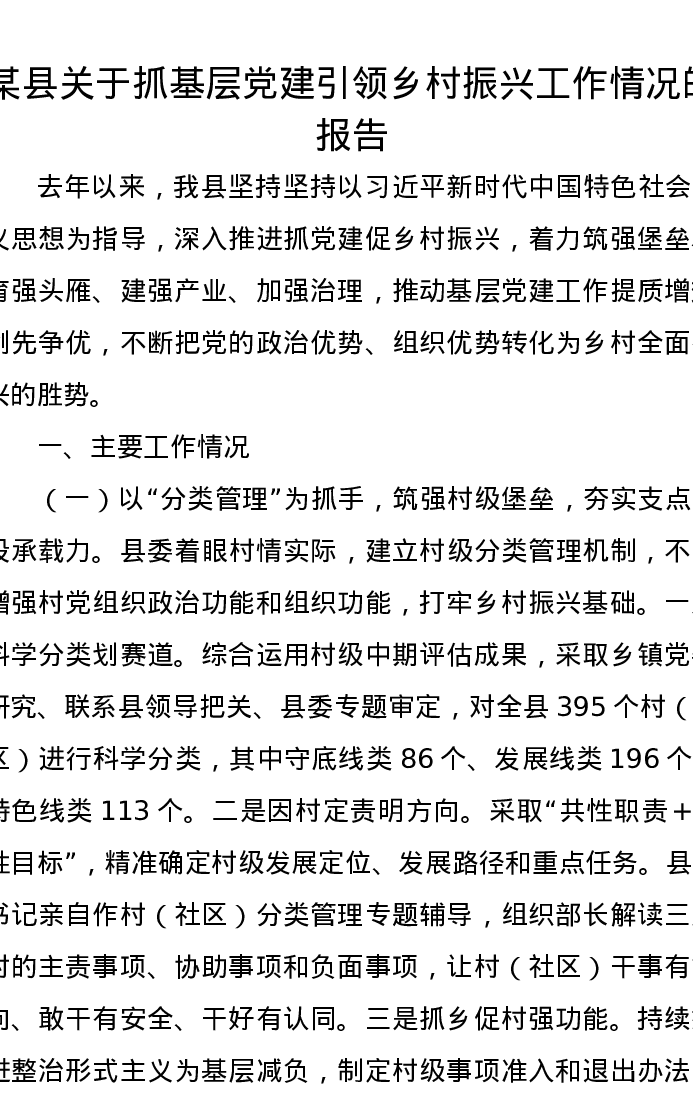 某县关于抓基层党建引领乡村振兴工作情况的报告