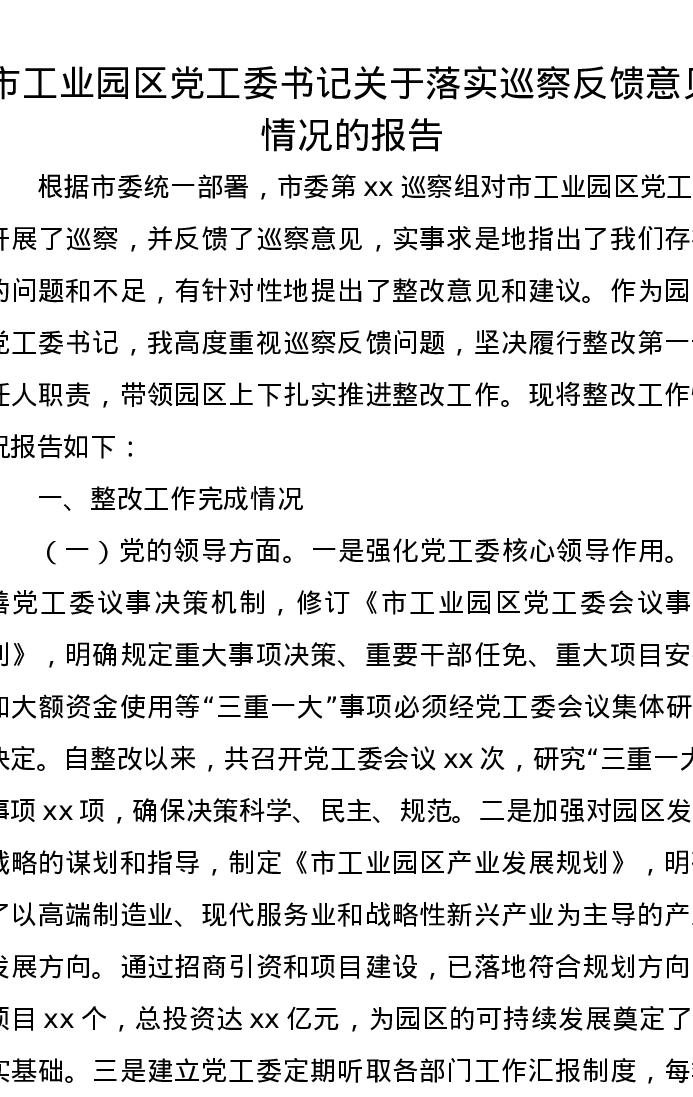 市工业园区党工委书记关于落实巡察反馈意见情况的报告