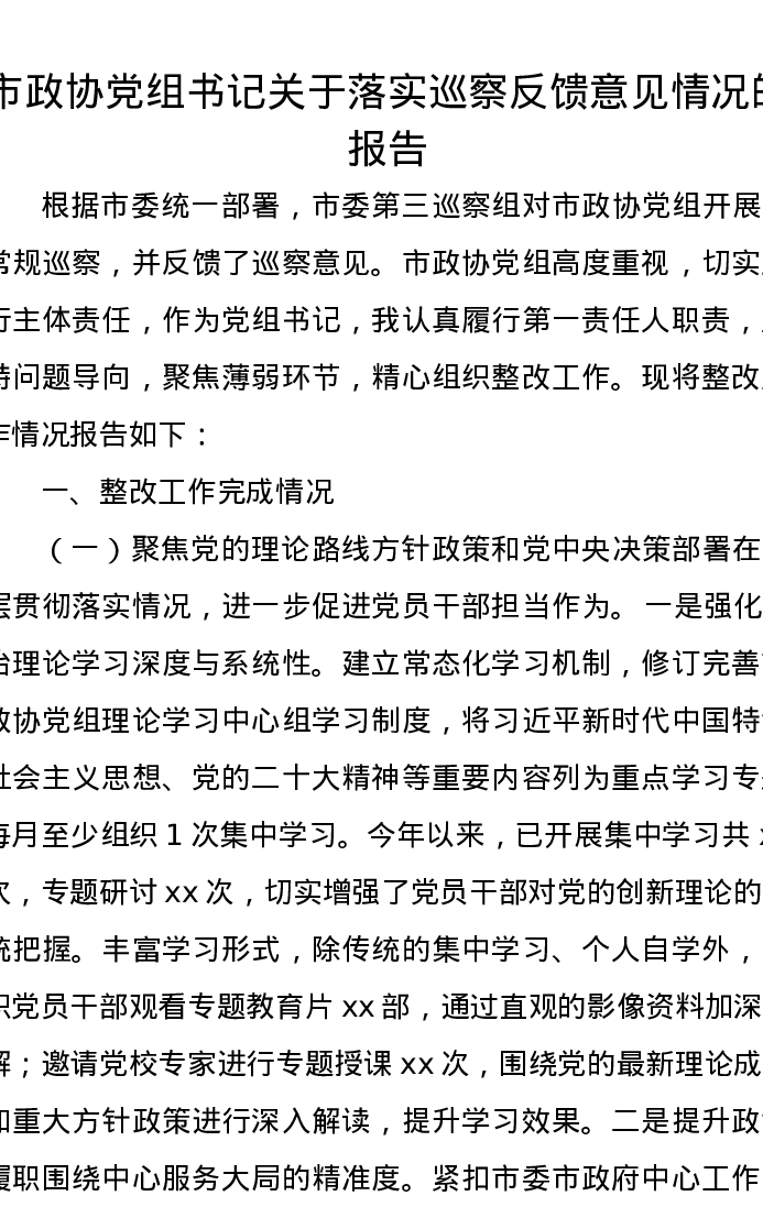 市政协党组书记关于落实巡察反馈意见情况的报告