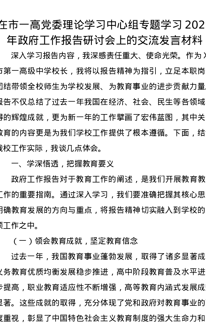 在市一高党委理论学习中心组专题学习2025年政府工作报告研讨会上的交流发言材料