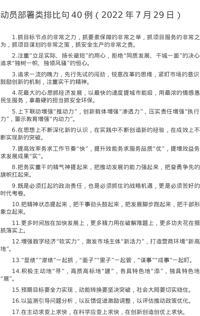 20220729【写作素材】动员部署类排比句40例(2022年7月29日)