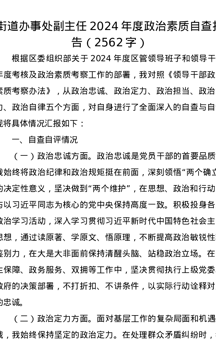 街道办事处副主任2024年度政治素质自查报告(2562字)