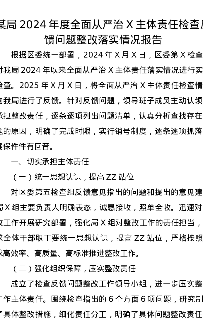 某局2024年度全面从严治X主体责任检查反馈问题整改落实情况报告