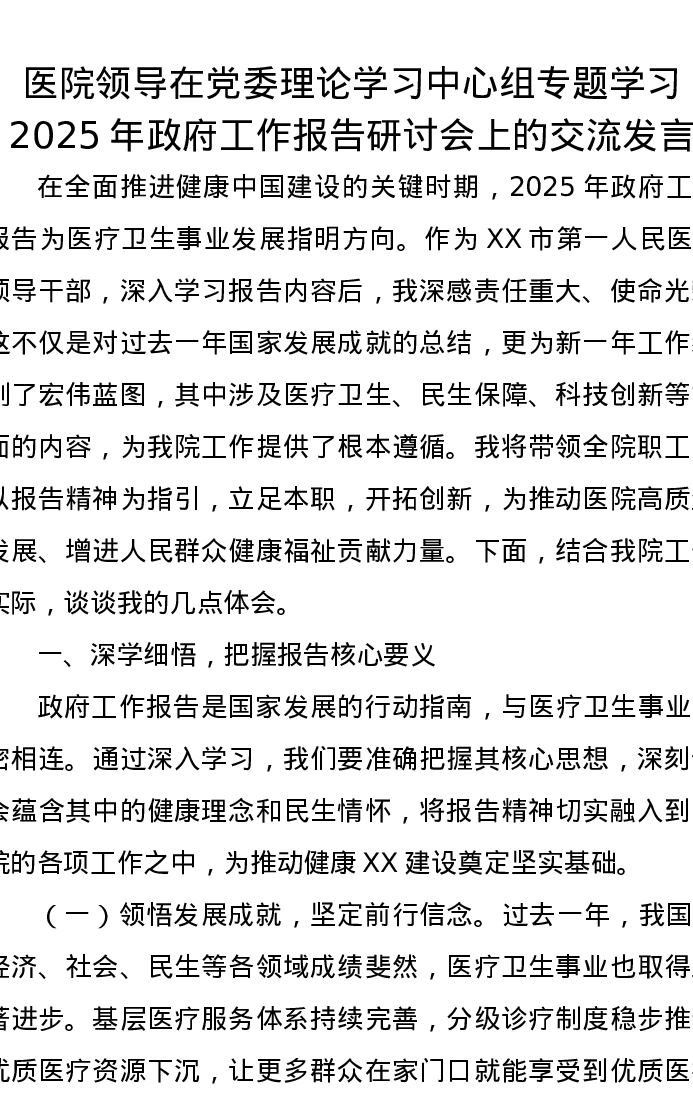 医院领导在党委理论学习中心组专题学习2025年政府工作报告研讨会上的交流发言