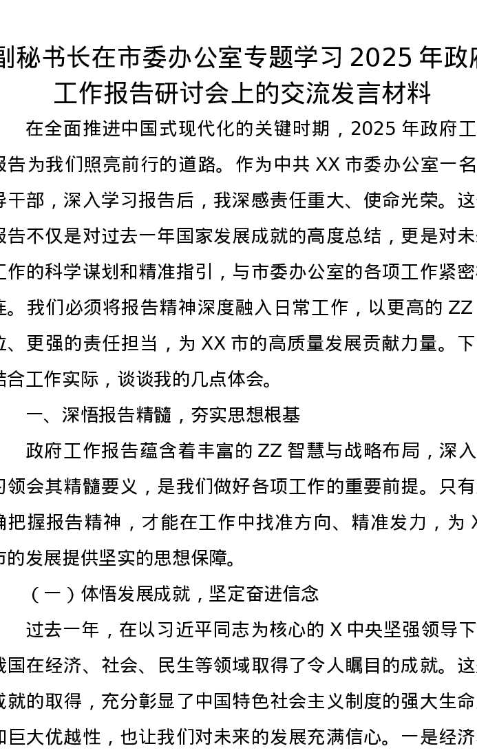 副秘书长在市委办公室专题学习2025年政府工作报告研讨会上的交流发言材料