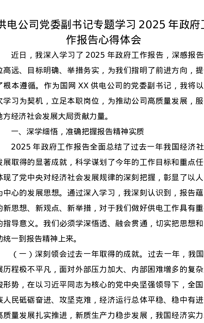 供电公司党委副书记专题学习2025年政府工作报告心得体会