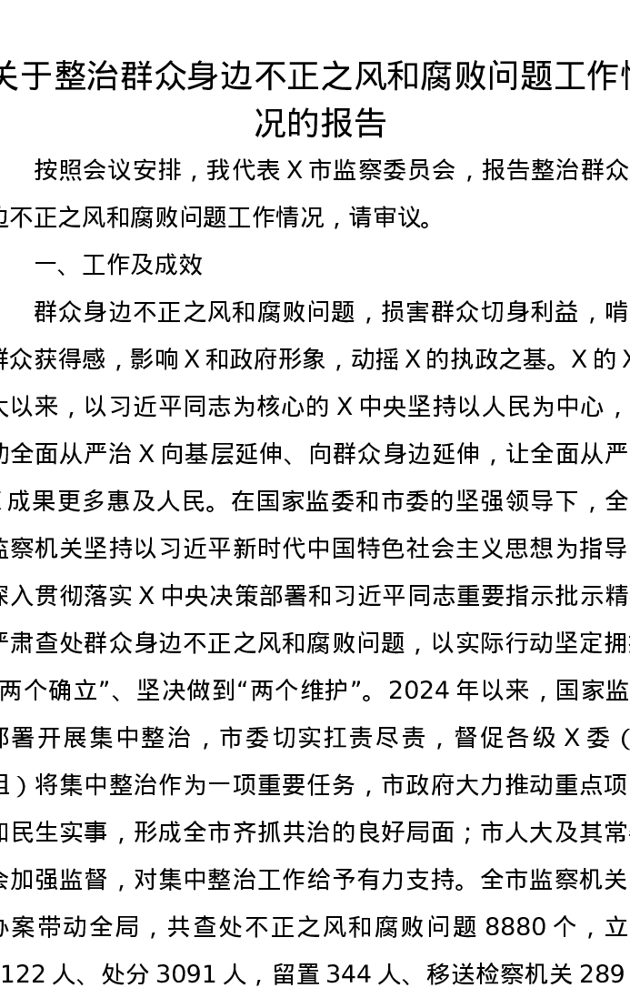 关于整治群众身边不正之风和腐败问题工作情况的报告